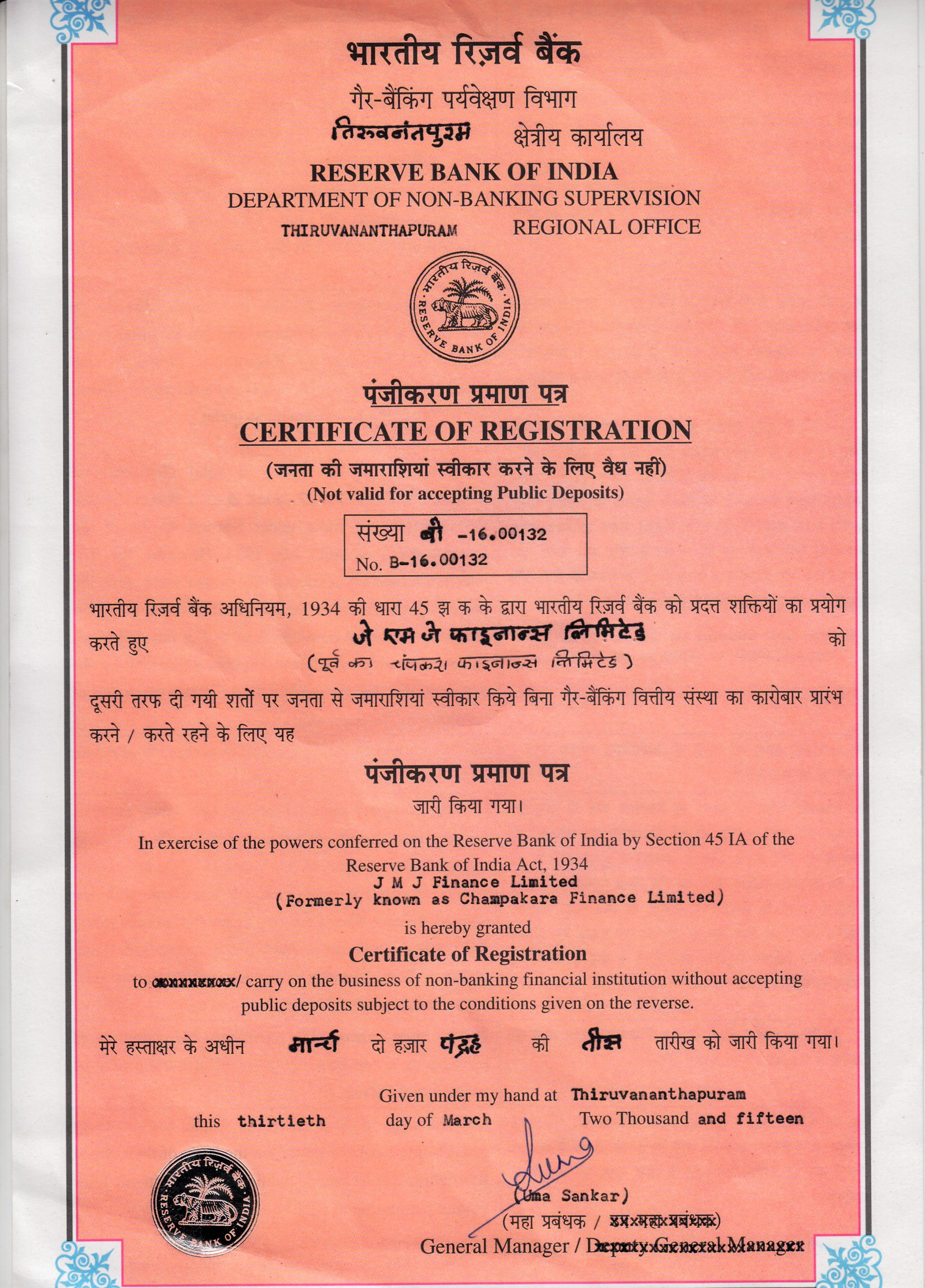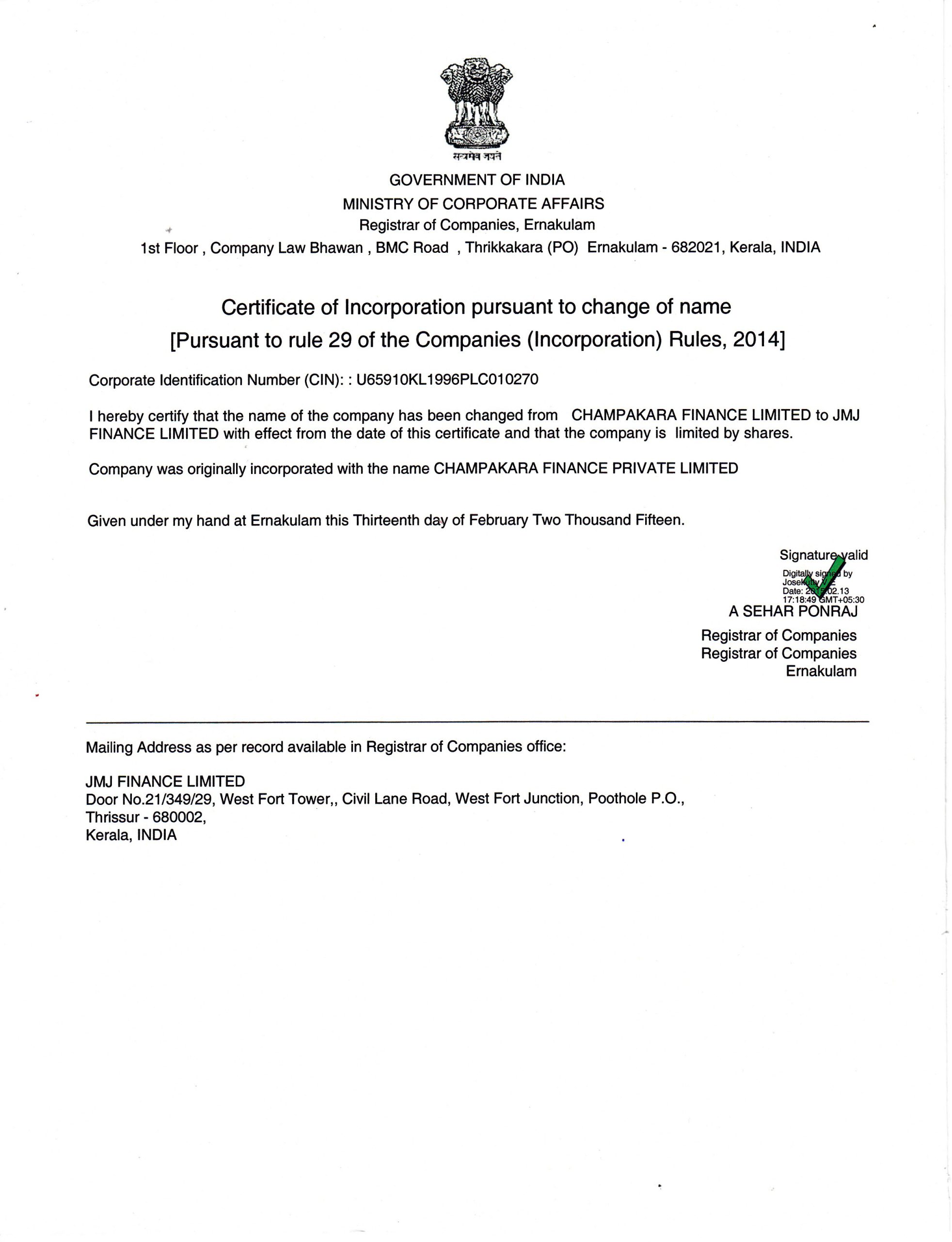 Door No.25/469/23, 3rd Floor, Pooma Complex, Naduvilal Jn., M.G Road, Thrissur 680001 Kerala India Ph : +91 487 2428175 Email : jmj@jmjfinance.com