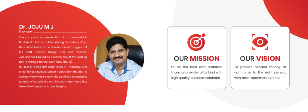 JMJ FINANCE LIMITED belongs to JMJ Group which had its humble beginning in and around Thrissur in late 1990’s. “JMJ Finance Limited” was born in 2013 by change of management of “Champakara Finance Limited”, one of the reputed NBFCs in Kerala. JMJ group is at present a conglomeration of various business concerns / activities. JMJ Group had a steady and rapid growth during past years in chitty, finance and Nidhi business. JMJ has been accepted by its customers as a synonym for trust, stability and reliability in business.